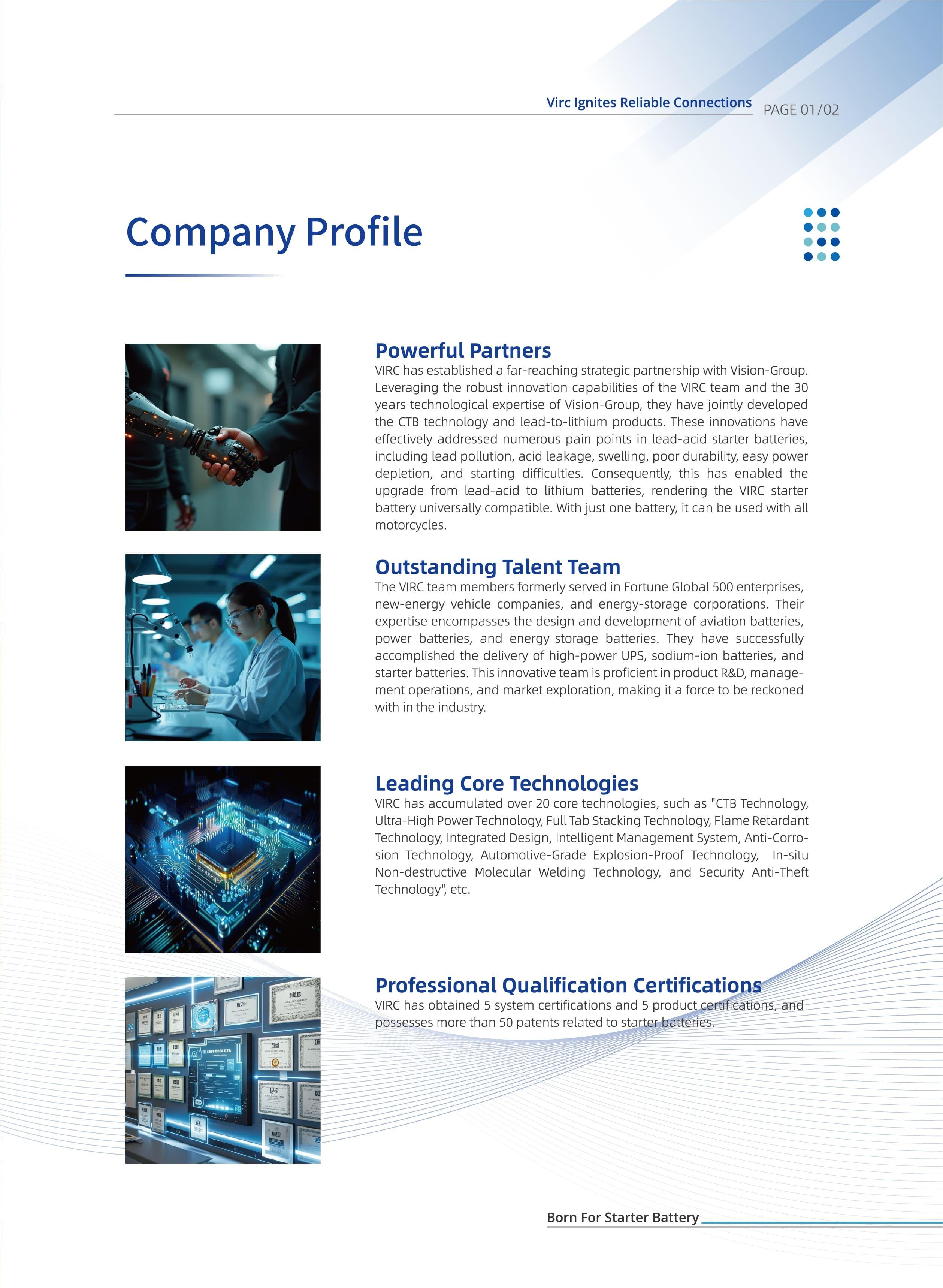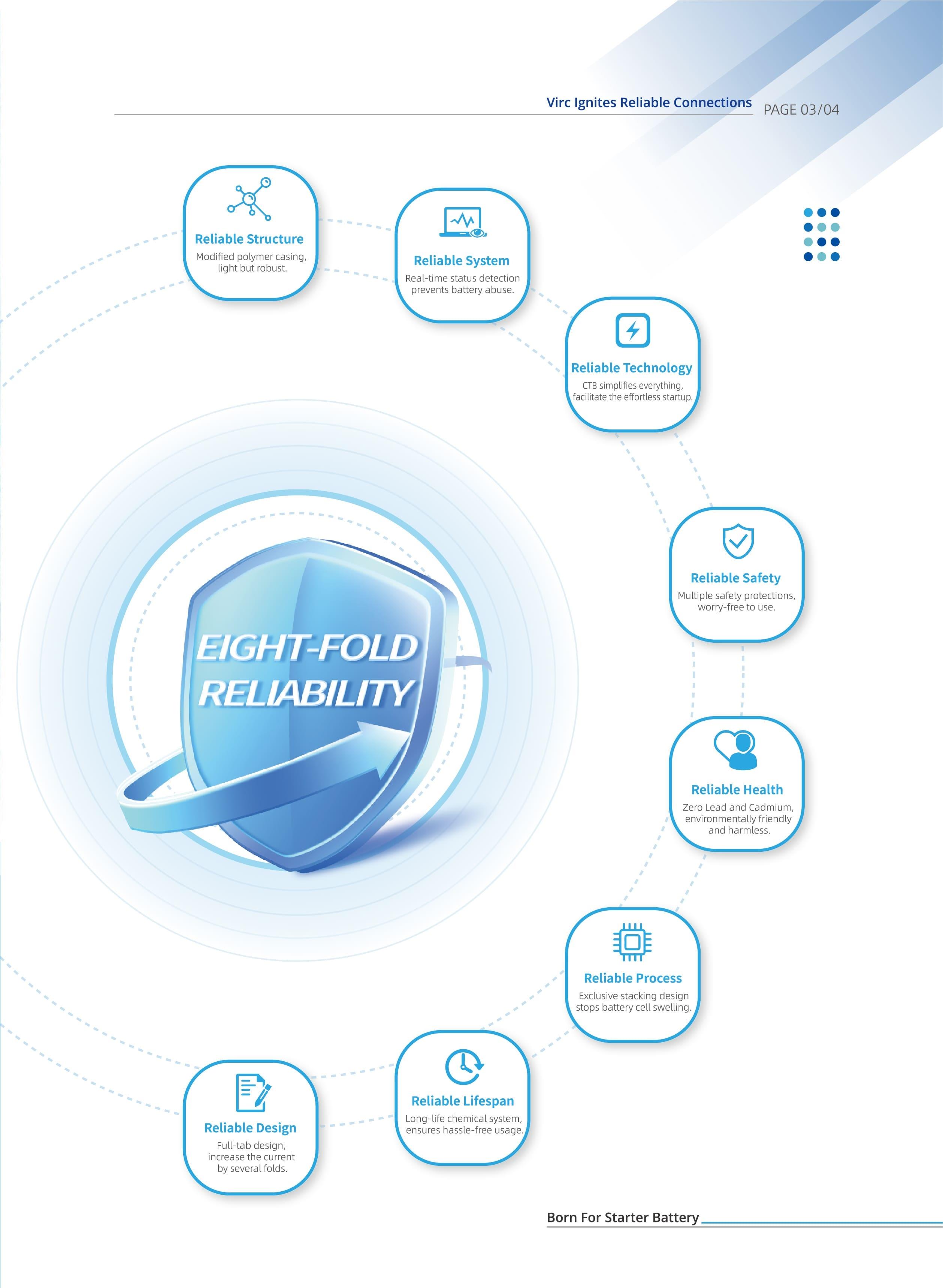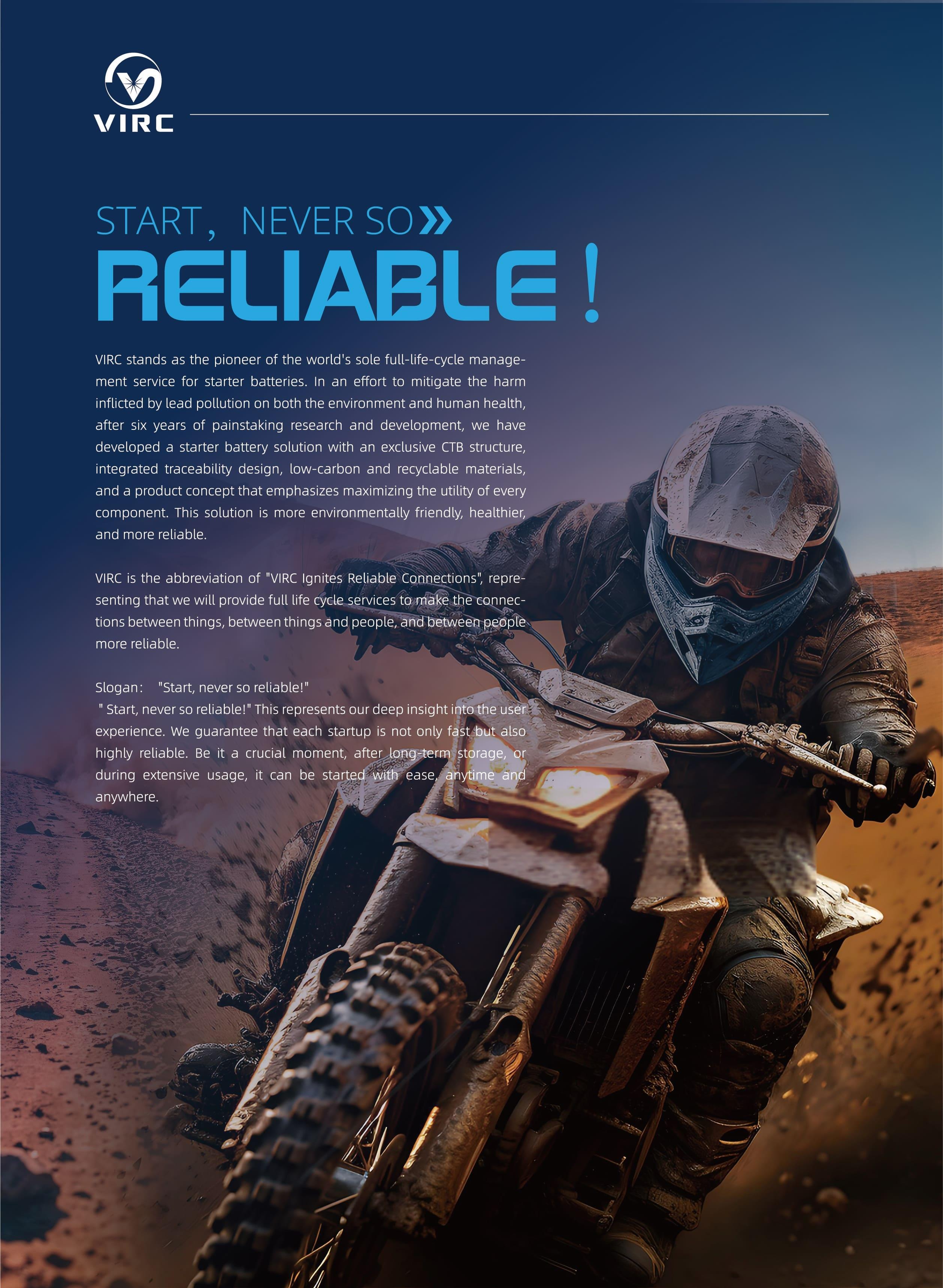 START,NEVER SO》 RELIABLE VRC stands as the pioneer of the warld's sale full-life-cycle manage- ment service for starter batteries.In an efort to mitigate the hamm inflicted by lead pollution on both the environment and human health, after six years of painstaking research and development,we have developed a starter battery solution with an exclusive CTB structure, integrated traceablty design,low-carbon and recyclable materials, and a product concept that emphasizes maximizing the utility of every component.This solution is more ervironmentally friendly,healthier, and more reliable. VRC is the abbreviation of "VIRC Ignites Reliable Connections repre- senting that we will pravide full fe cycle services to make the connec- tions between things,between things and people,and between pedple more rellable. Slogan:"Start,never so reliable!" Start never so reliable!"This represents our deep insight into the user experience.We guarantee that each startup is not only fast but also highly reliable.Be it a crucial moment,after lang-term during extensive usage,it can be started with ease,anytime and anywhere.More